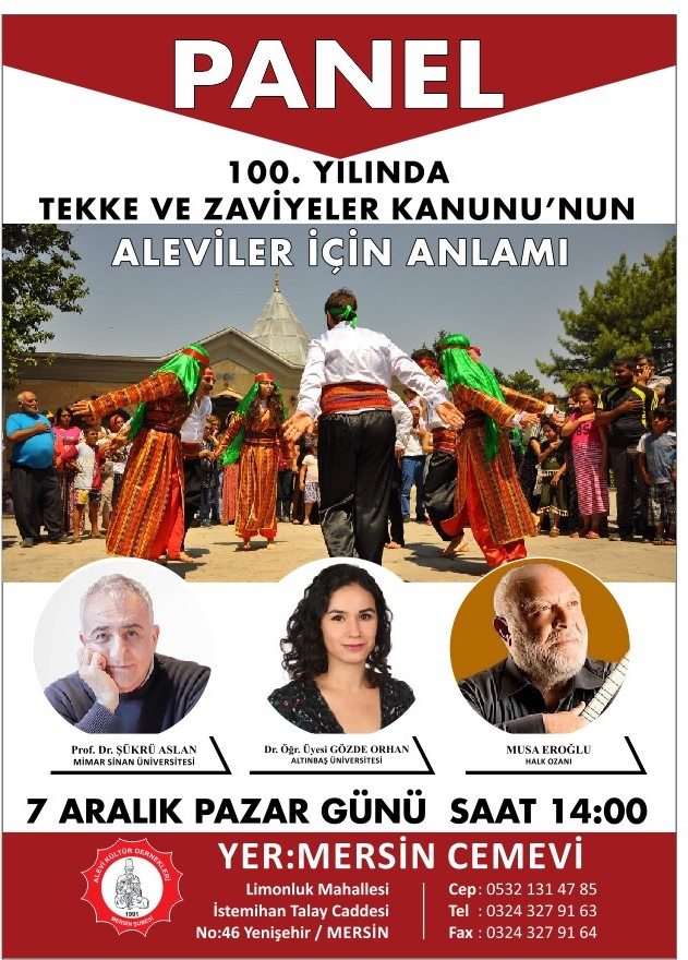 Mersin Cemevi olarak Tekke ve Zaviyeler Kanunu’nun Aleviler için anlamını ele alan bir panel düzenliyoruz. Eğitim alanında uzman hocalarımız Prof. Dr. Şükrü Aslan ve Dr. Öğr. Üyesi Gözde Orhan bizlere önemli bilgiler sunacak. Halk Ozanımız Musa Eroğlu ise deyişleriyle programa renk katacaktır. Tüm canları bu önemli panele bekliyoruz.”diye konuştu